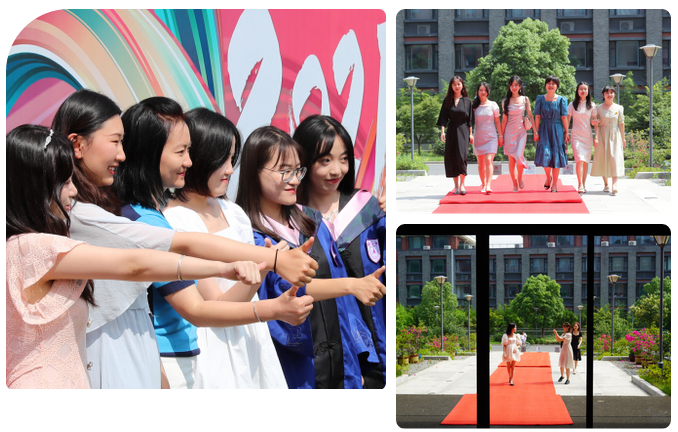 典礼开始前,紫金楼门口铺设了红毯,架起了签名墙,迎接陆续到来的2021届毕业生们。